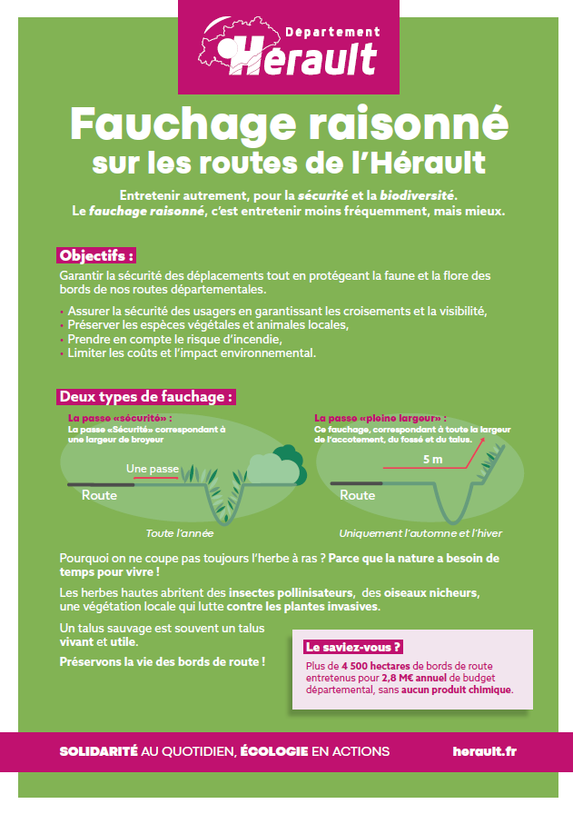 Conscients de nos limites et de celles de notre planète, le Département a souhaité imaginer une autre manière d’aménager le territoire héraultais et d’organiser ses mobilités, en utilisant des routes réconciliées avec la nature. Telle est l’ambition de son « Plan Routes et Biodiversité ».