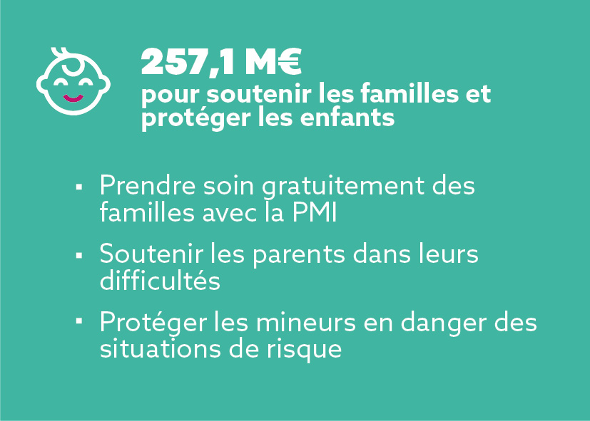 - L’Enfance et la famille : aide sociale à l’enfance (ASE), la Protection maternelle et infantile (PMI), l’adoption, le soutien aux familles en difficulté financière.